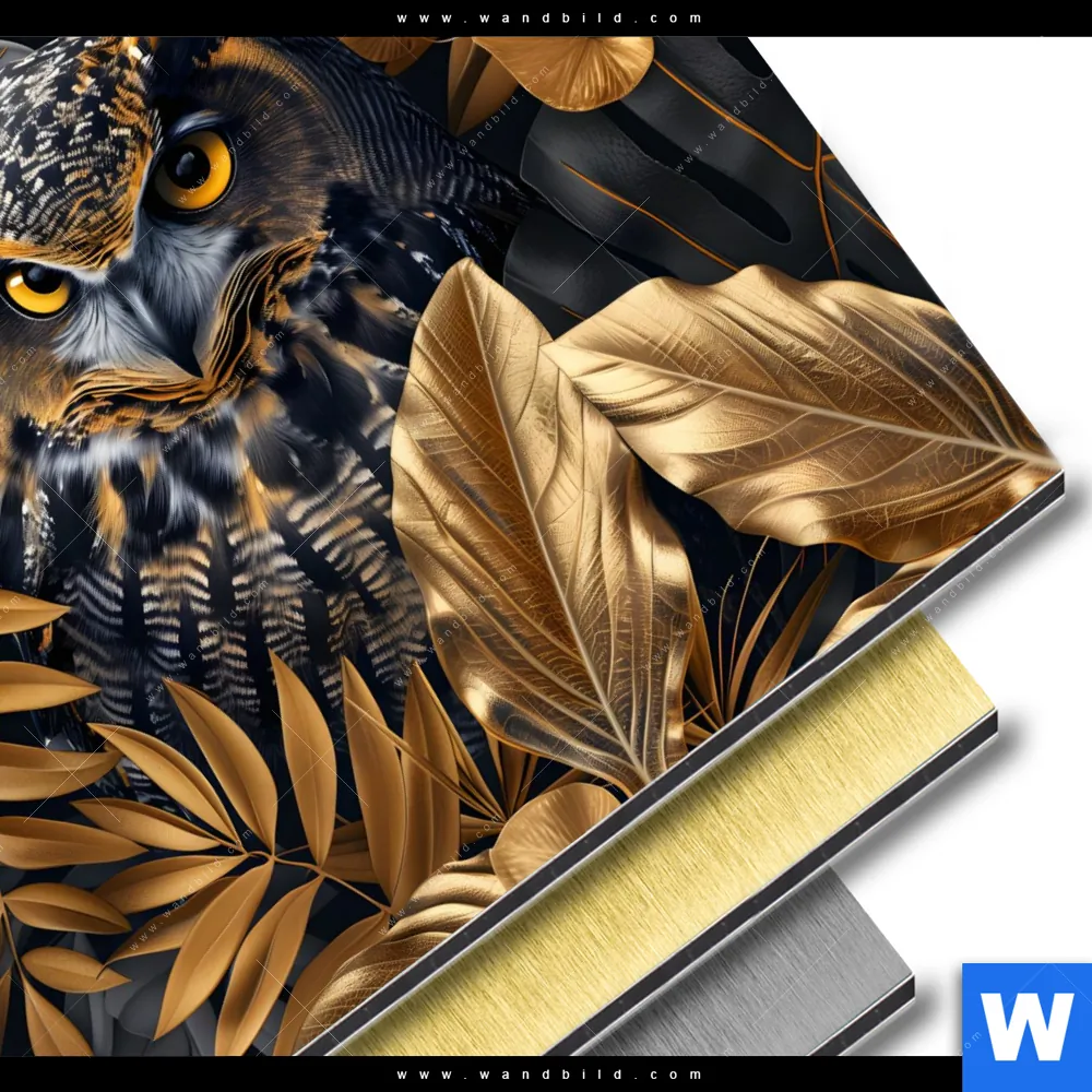 Aluminiumbild gebürstet | Eule und goldene Blätter | Rund