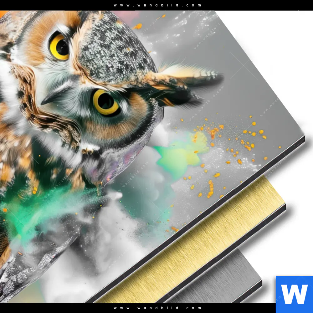Aluminiumbild gebürstet | Farbenexplosion mit Eule | Hochformat