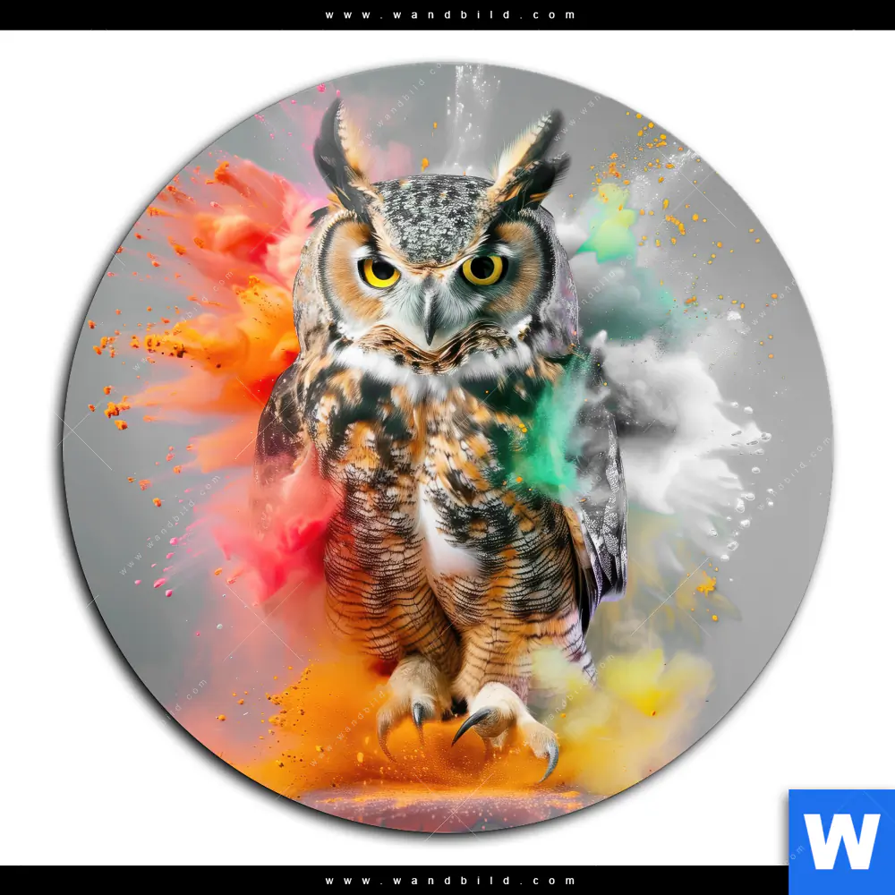 Aluminiumbild gebürstet | Farbenexplosion mit Eule | Rund