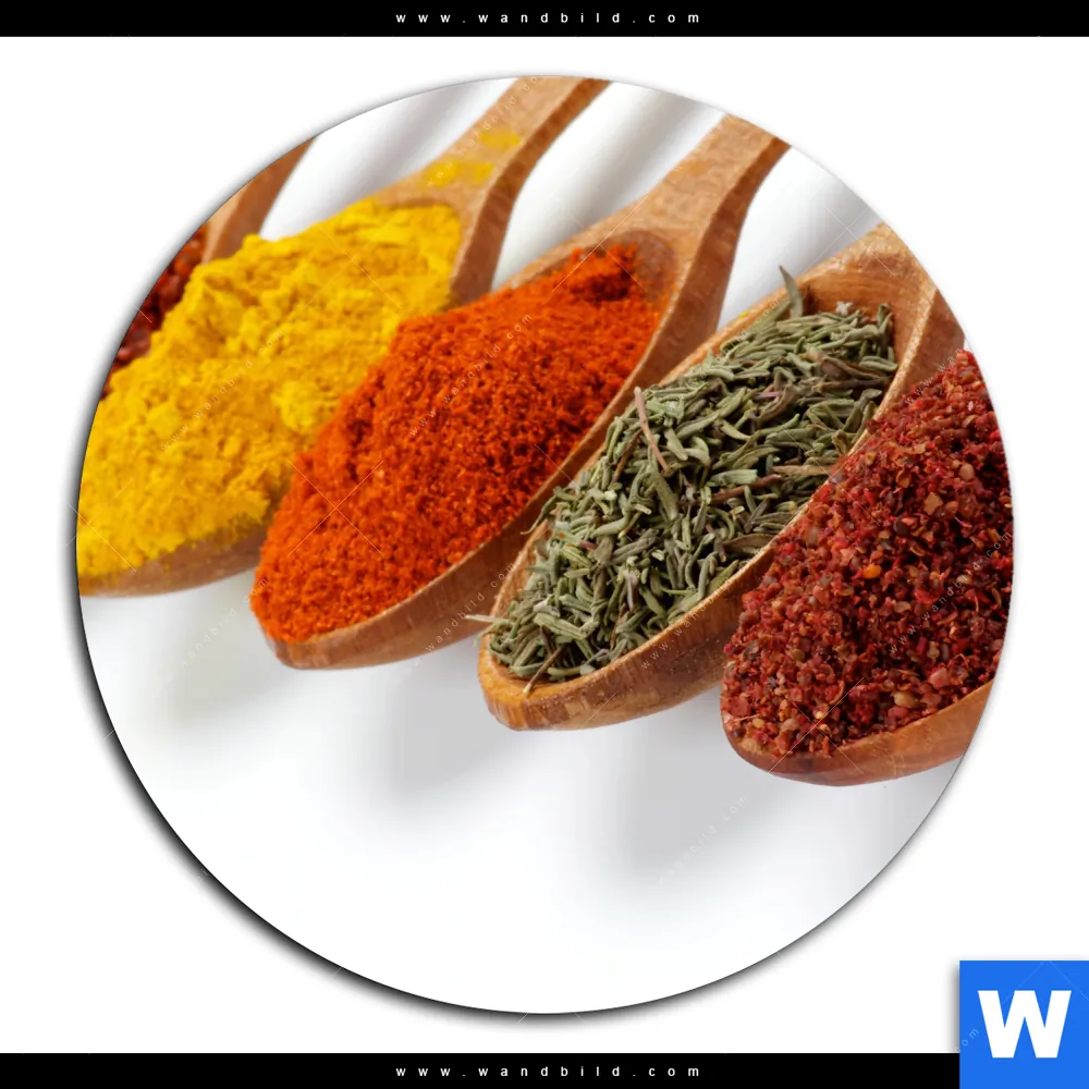 Aluminiumbild gebürstet | Farbige Gewürze auf Holzlöffel | Rund