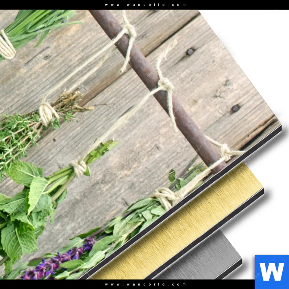 Aluminiumbild gebürstet | Frische Kräuter an Holzstange | Hochformat