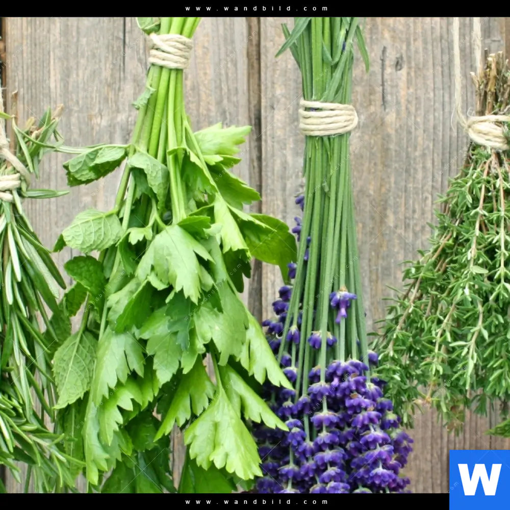 Aluminiumbild gebürstet | Frische Kräuter an Holzstange | Querformat