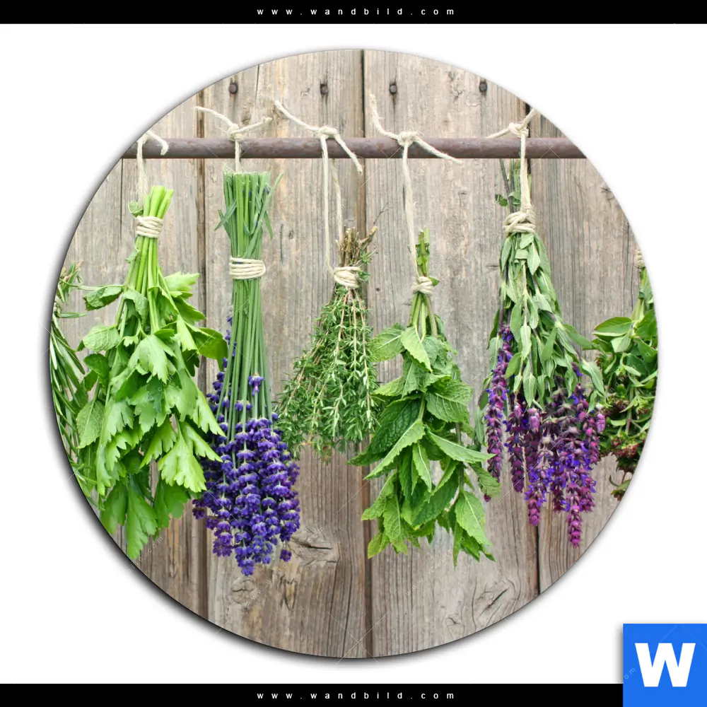 Aluminiumbild gebürstet | Frische Kräuter an Holzstange | Rund