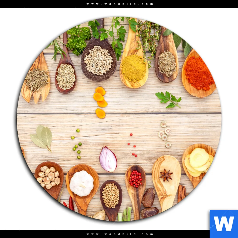 Aluminiumbild gebürstet | Gewürze auf hölzernen Löffeln | Rund