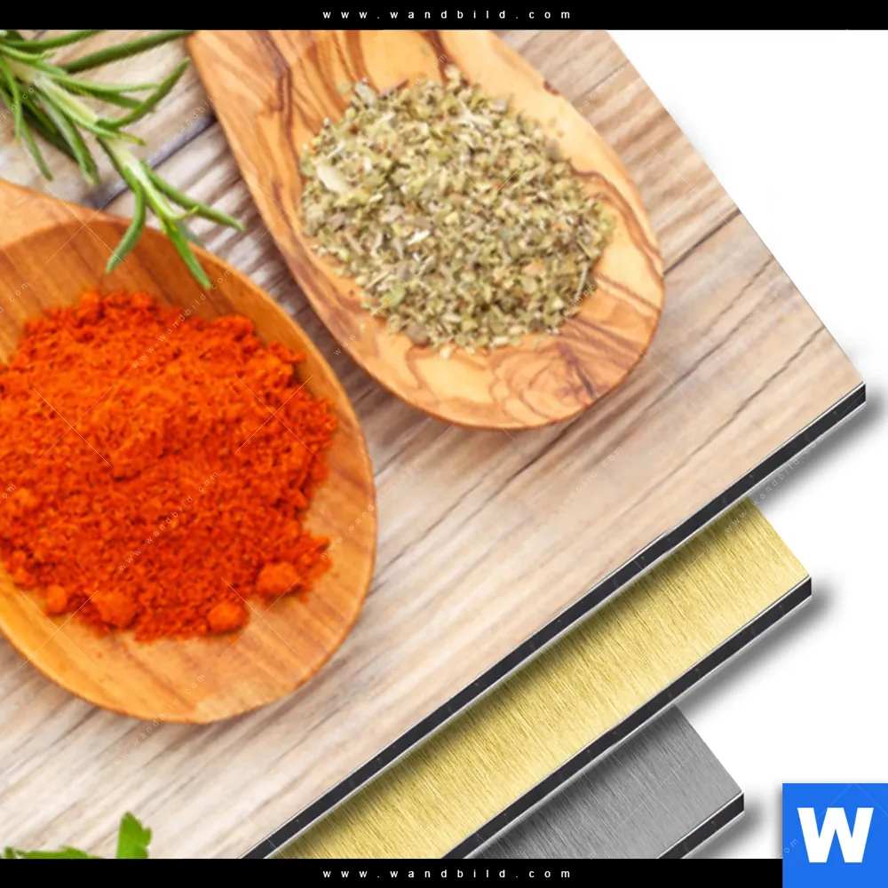 Aluminiumbild gebürstet | Gewürze auf hölzernen Löffeln | Schmal