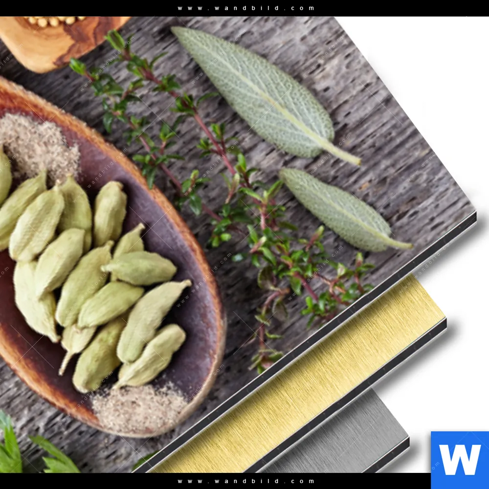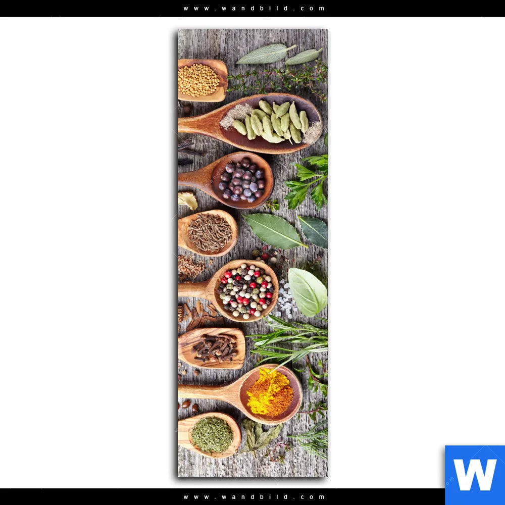Aluminiumbild gebürstet | Gewürze auf Holzlöffeln | Schmal