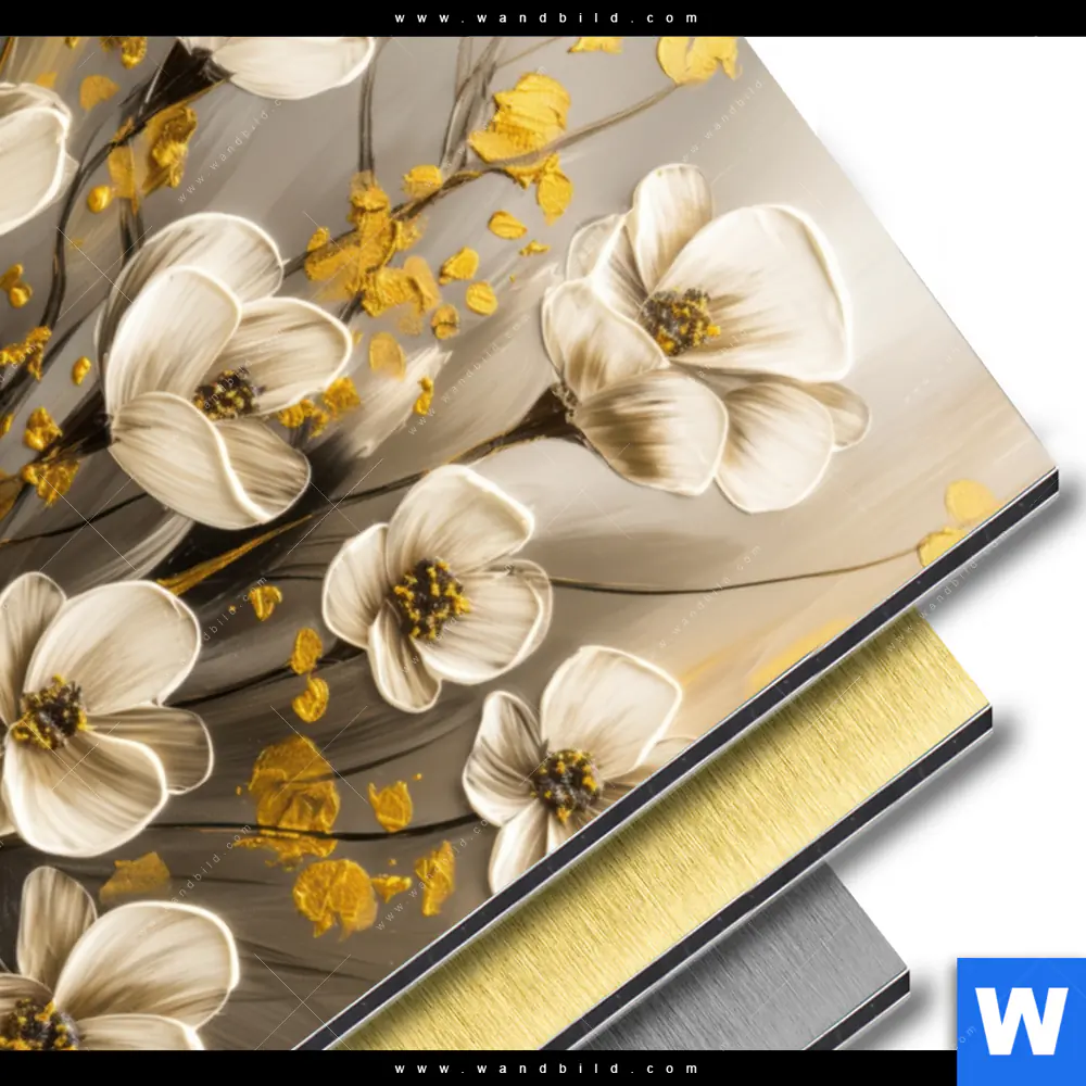 Aluminiumbild gebürstet | Goldene Blütenpoesie | Hochformat