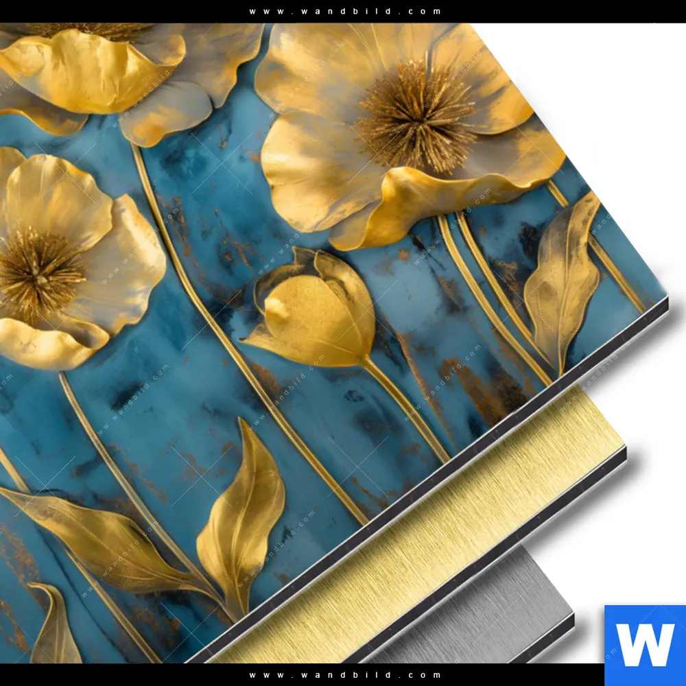 Aluminiumbild gebürstet | Goldene Blumen auf Blau | Querformat