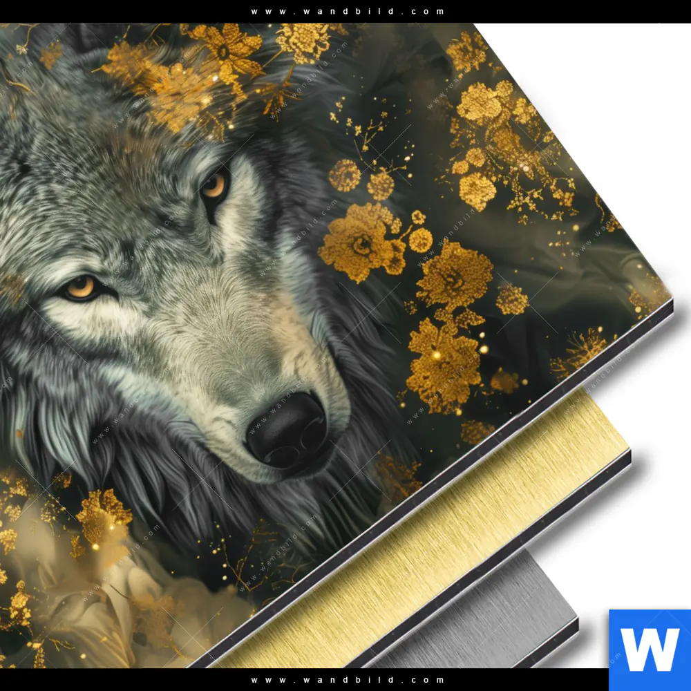 Aluminiumbild gebürstet | Goldener Wolfblick | Quadrat