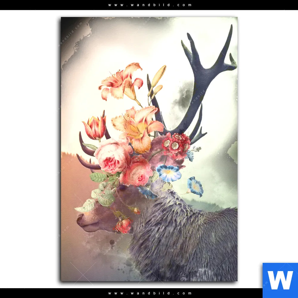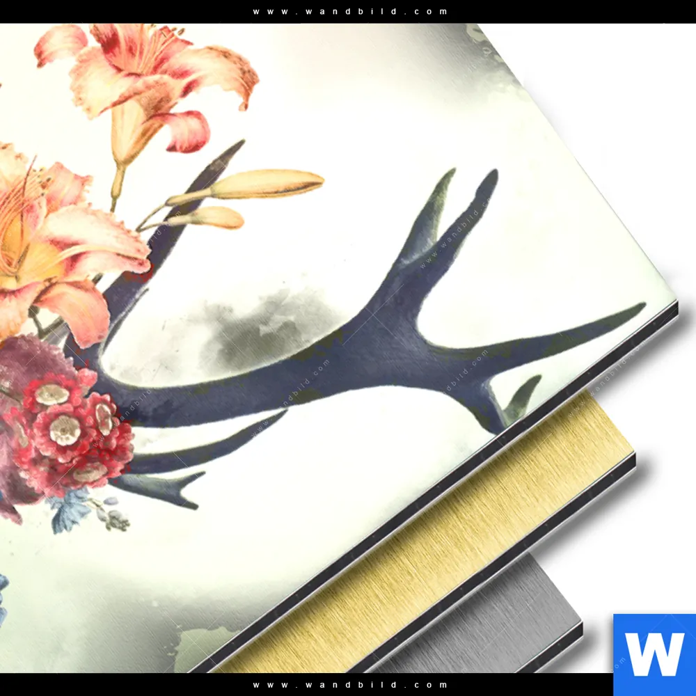 Aluminiumbild gebürstet | Hirsch & Blumen | Hochformat