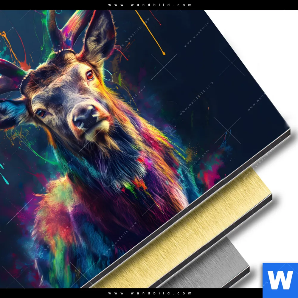 Aluminiumbild gebürstet | Hirsch im leuchtenden Farbmix | Quadrat