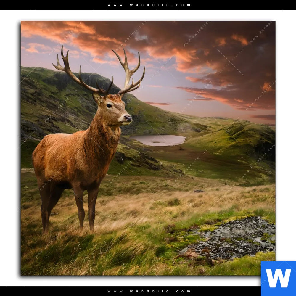 Aluminiumbild gebürstet | Hirsch in Gebirgslandschaft | Quadrat
