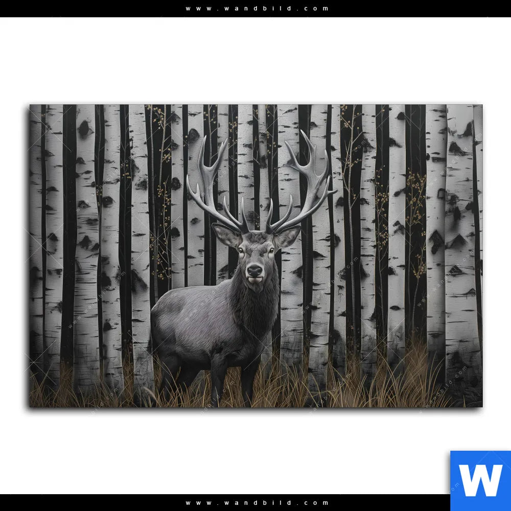 Aluminiumbild gebürstet | Hirschporträt vor Birken | Querformat