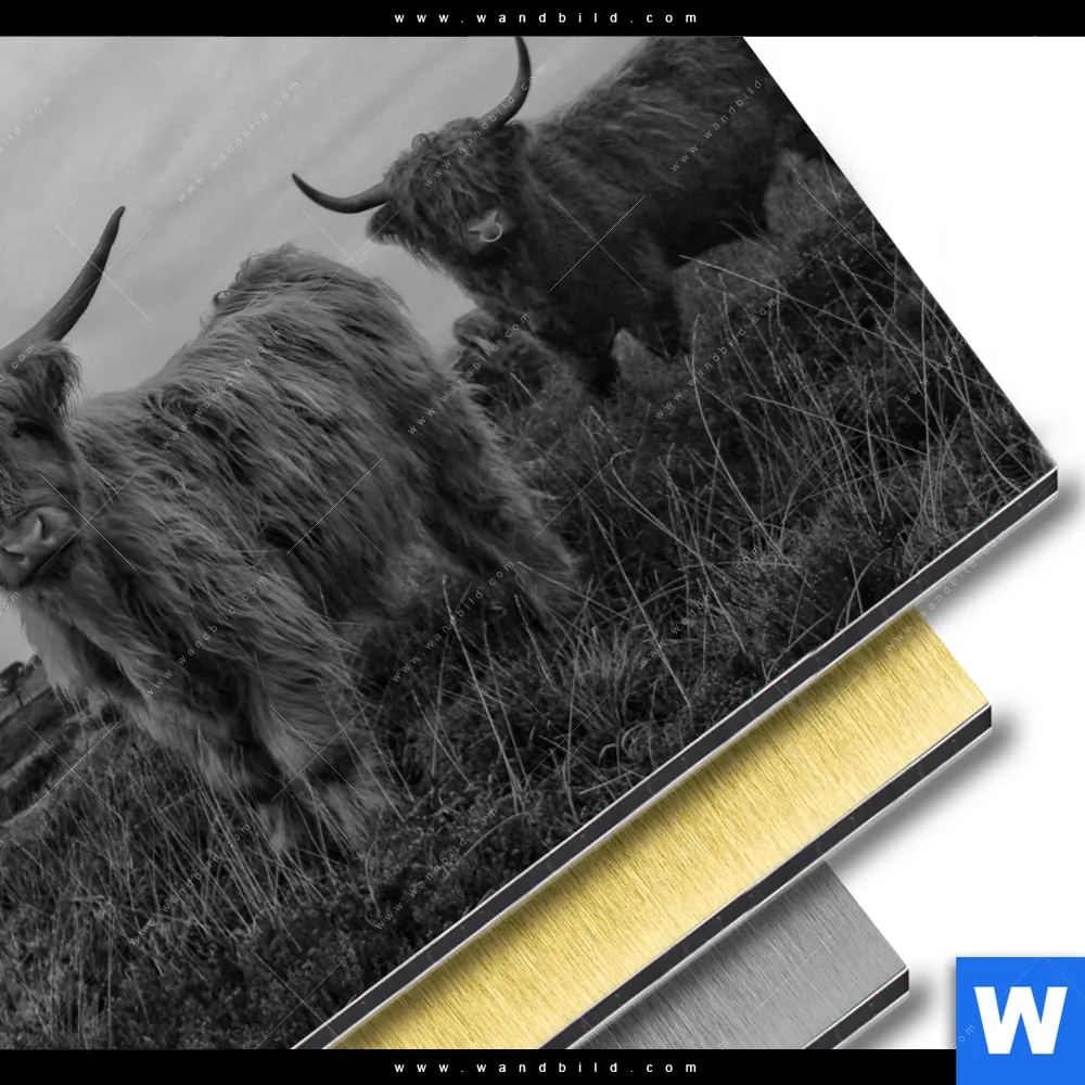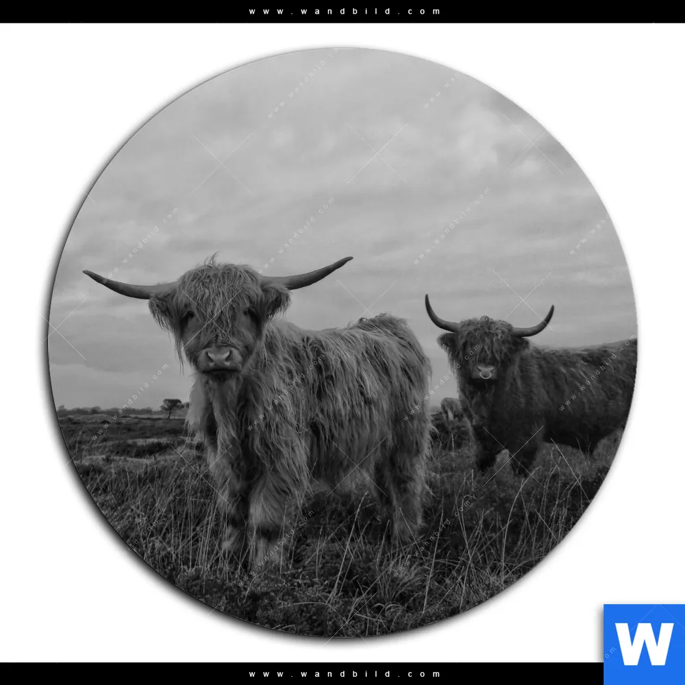 Aluminiumbild gebürstet | Hochland-Rind Schwarz-Weiß | Rund