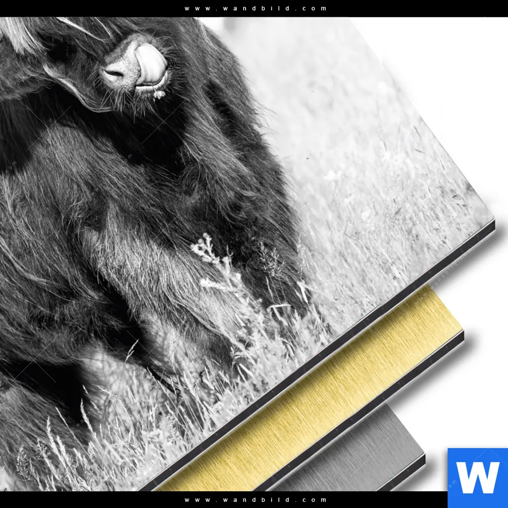 Aluminiumbild gebürstet | Hochlandkuh auf einer Wiese | Quadrat