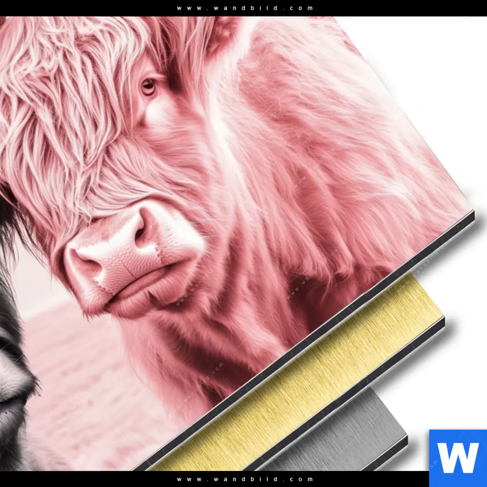 Aluminiumbild gebürstet | Hochlandrinder - Harmonie in Pastell | Querformat