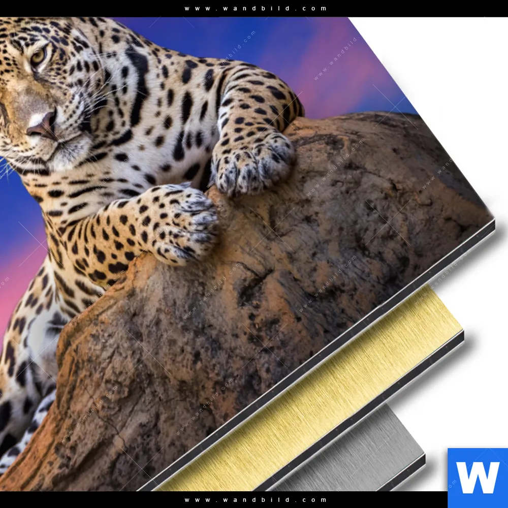 Aluminiumbild gebürstet | Jaguar auf Felsen | Querformat