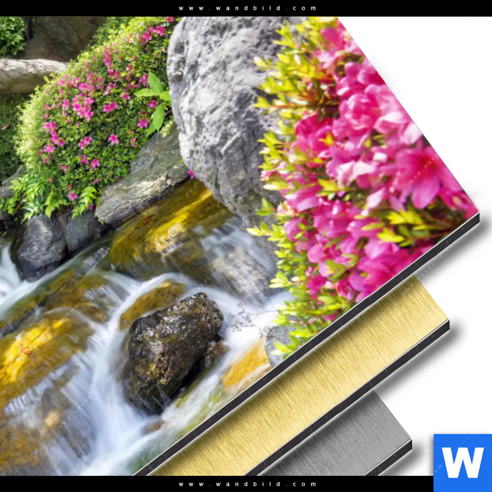 Aluminiumbild gebürstet | Japanischer Garten mit Wasserlauf | Querformat