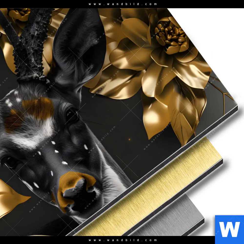 Aluminiumbild gebürstet | Junger Hirsch und Goldblumen | Querformat