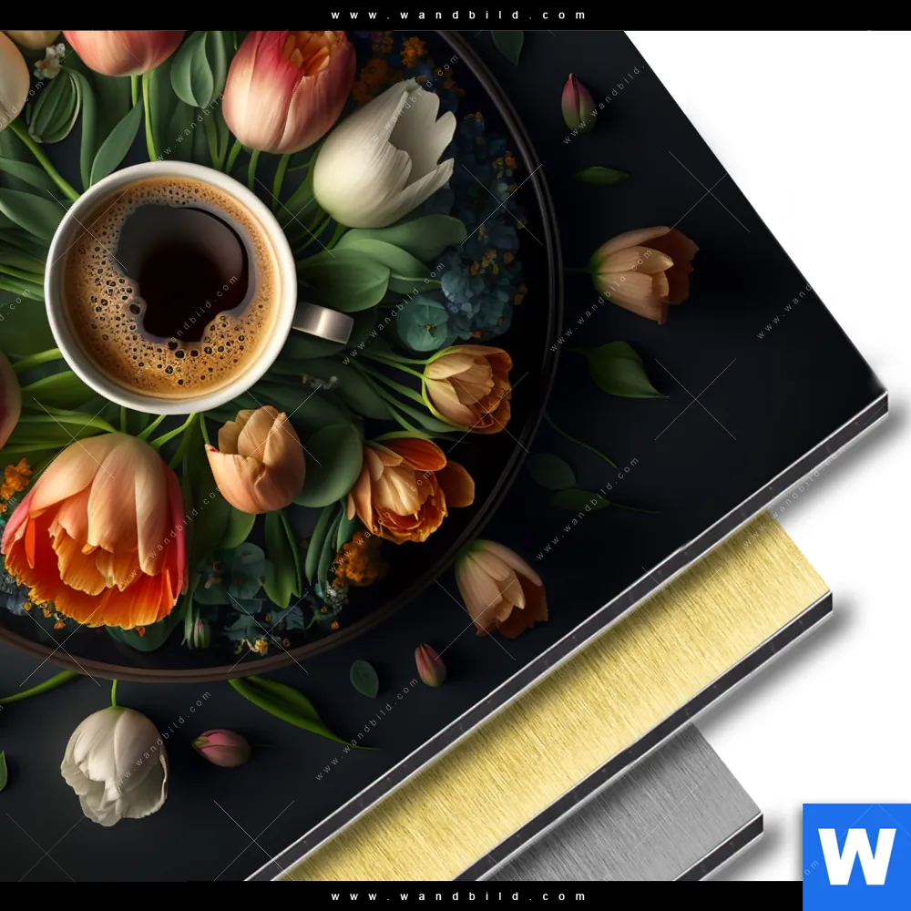 Aluminiumbild gebürstet | Kaffee inmitten wunderschöner Blumen | Rund