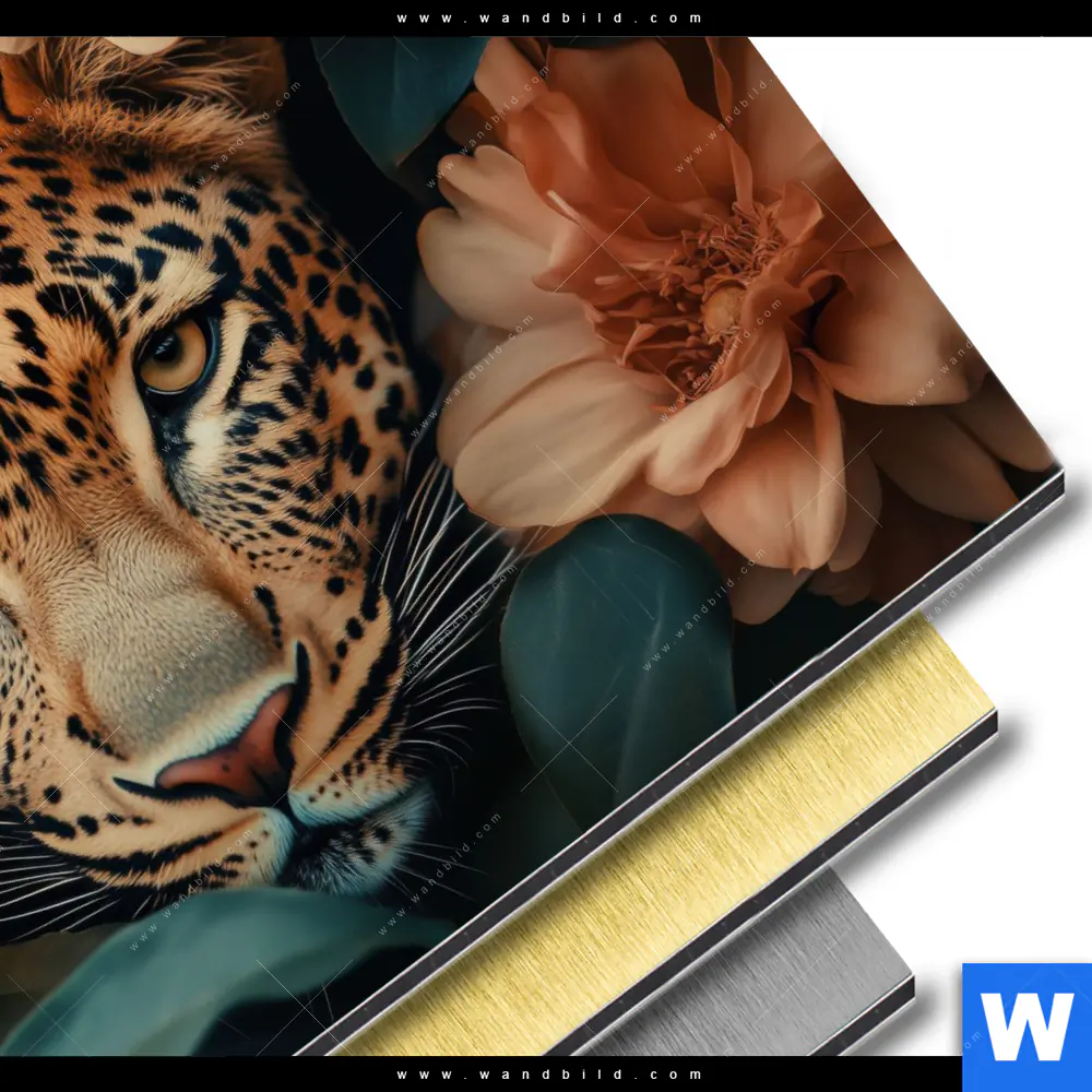 Aluminiumbild gebürstet | Leopard im Blütenmeer | Quadrat