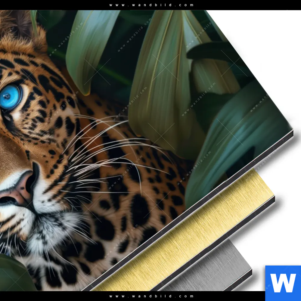 Aluminiumbild gebürstet | Leopard mit blauen Augen | Querformat