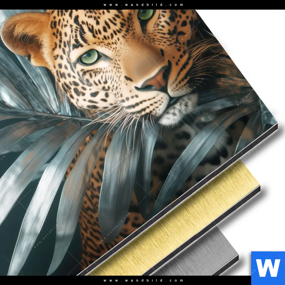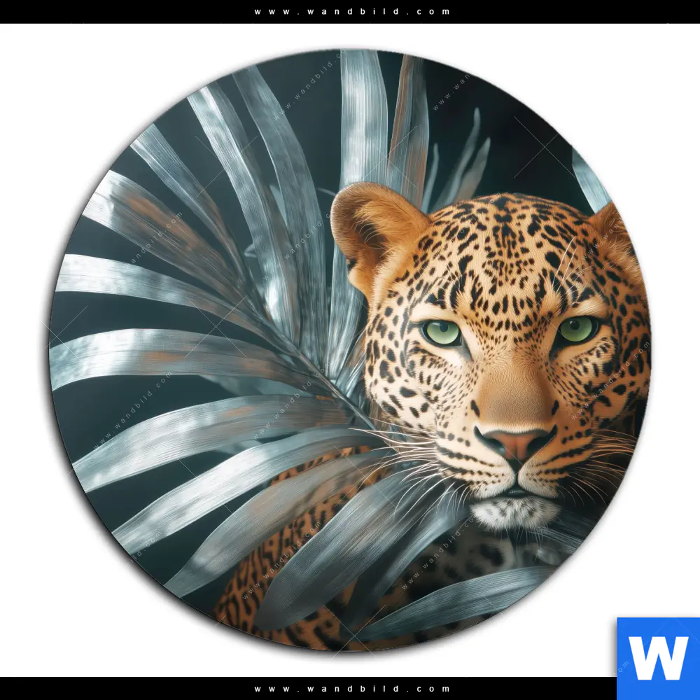 Aluminiumbild gebürstet | Leopard zwischen Blättern | Rund