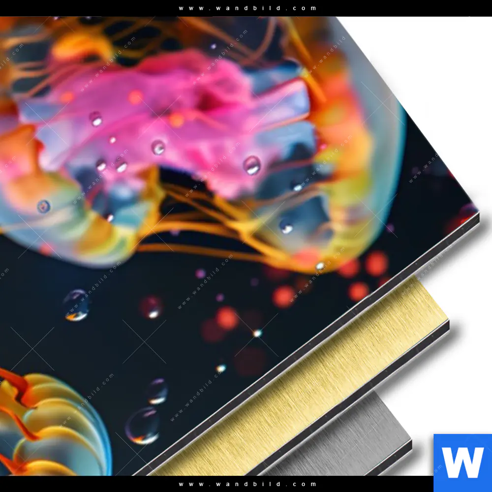 Aluminiumbild gebürstet | Leuchtende Quallen unter Wasser | Schmal