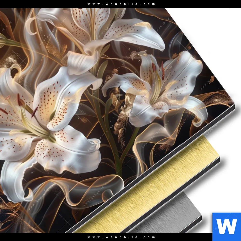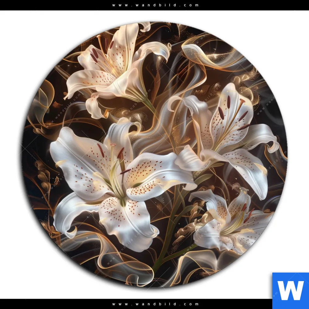 Aluminiumbild gebürstet | Lilien in goldenem Rauch | Rund