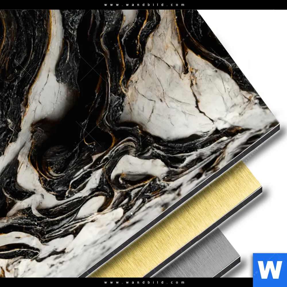 Aluminiumbild gebürstet | Liquid Marmor Schwarz Gold | Hochformat