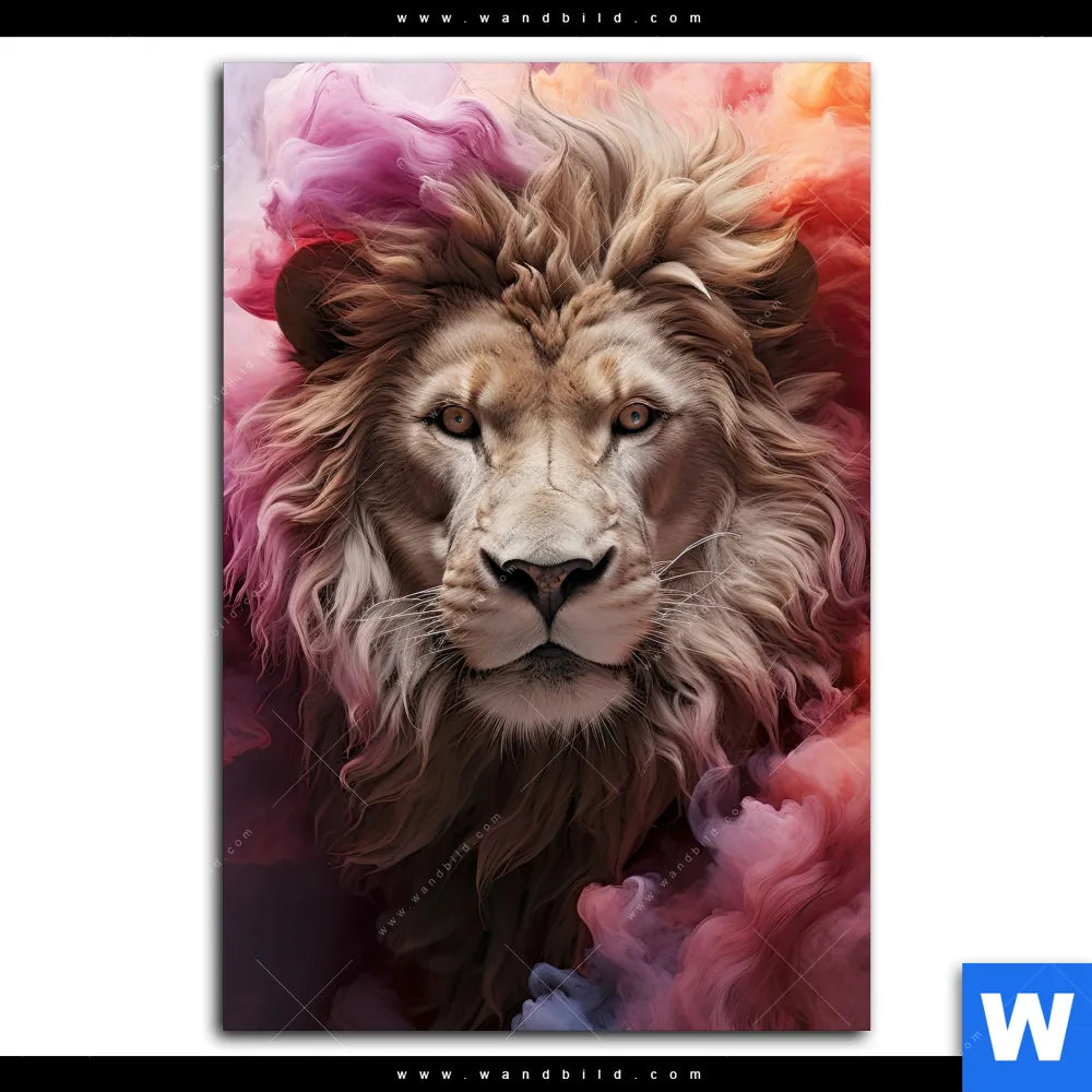 Aluminiumbild gebürstet | Löwengesicht in buntem Rauch | Hochformat