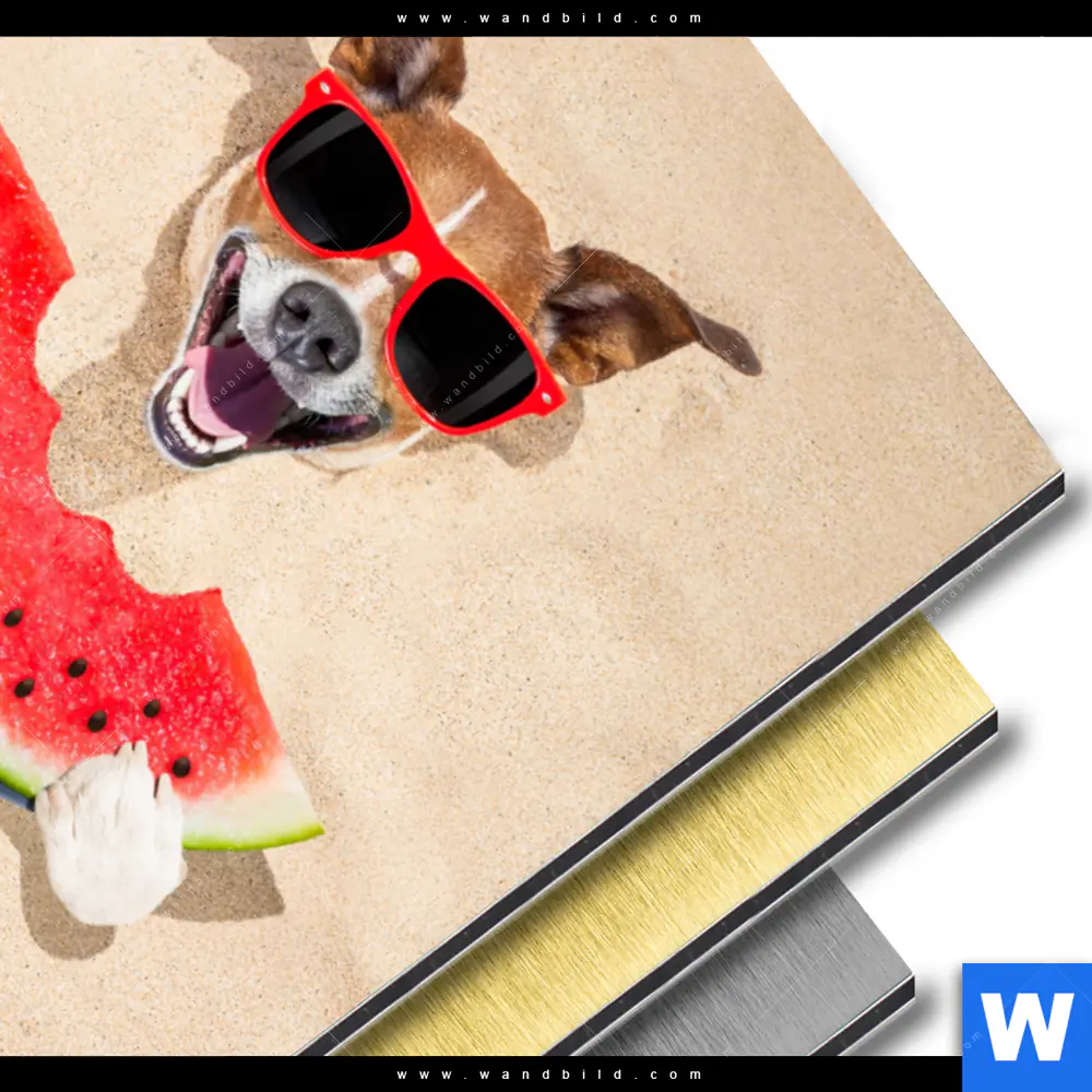 Aluminiumbild gebürstet | Lustiger Hund am Strand | Hochformat
