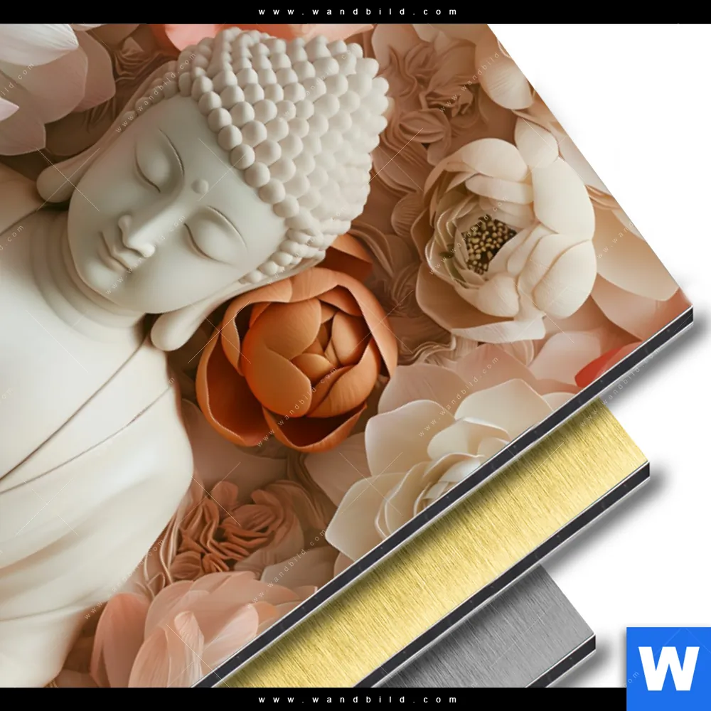Buddha - Feng Shui, Blumen - Botanik Aluminiumbild mit metallischem Effekt inkl. vormontiertem Rückrahmen