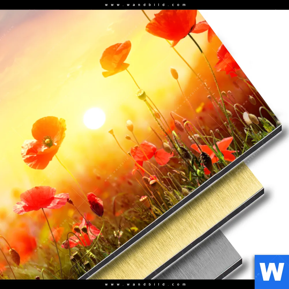 Aluminiumbild gebürstet | Mohnblumenfeld bei Sonnenuntergang | Querformat