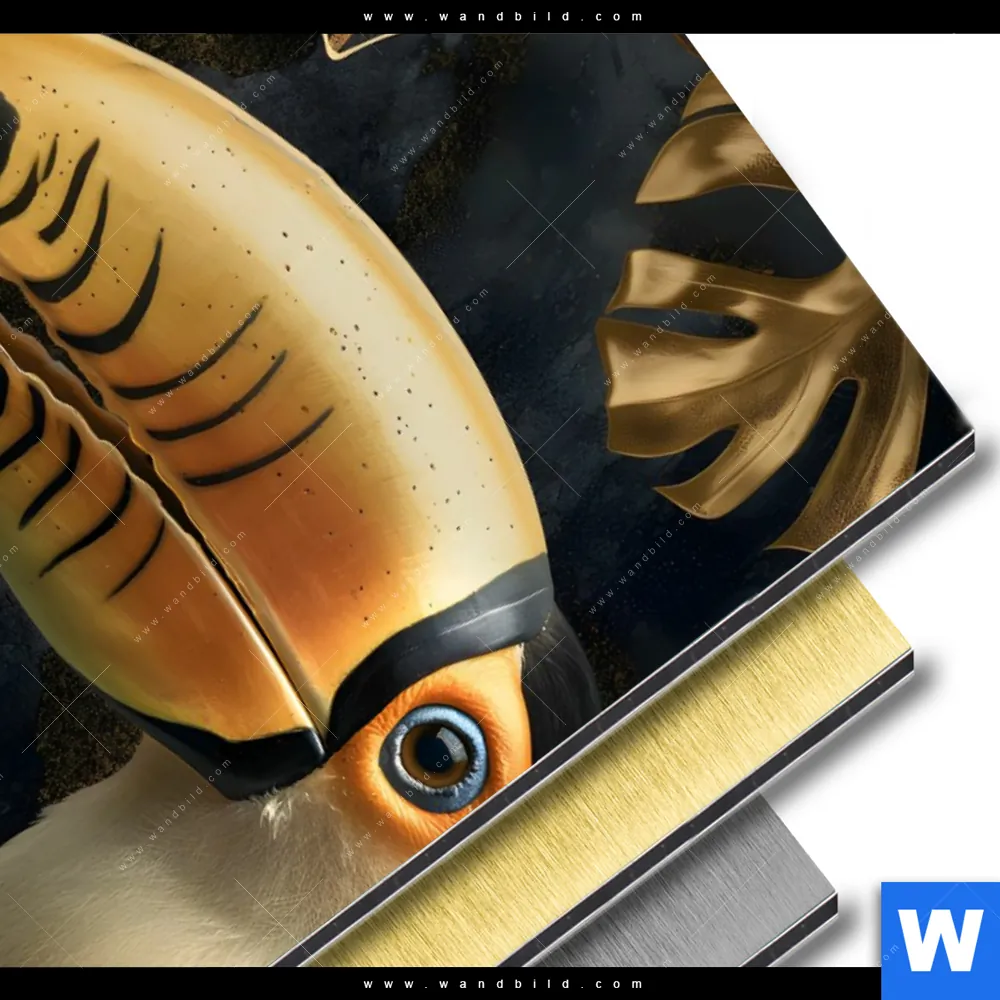 Aluminiumbild gebürstet | Monstera und Tukan Gold | Hochformat