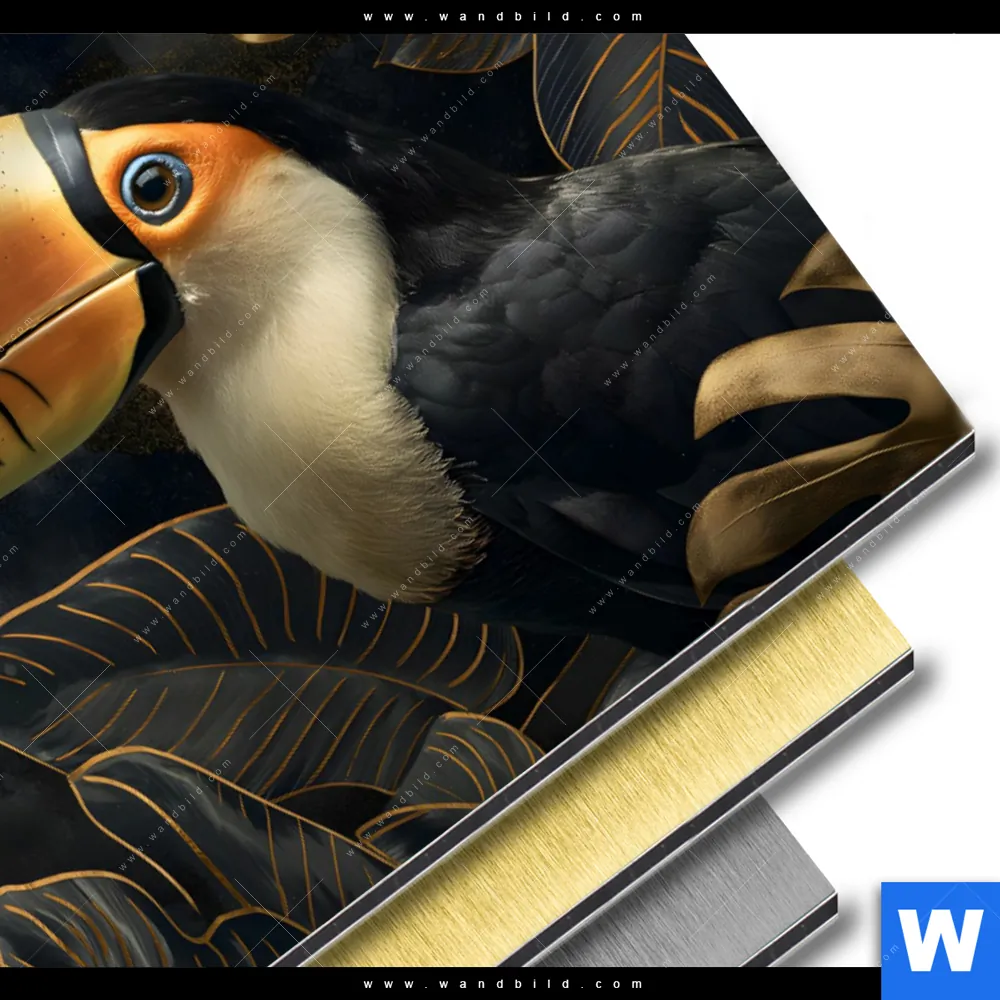 Aluminiumbild gebürstet | Monstera und Tukan Gold | Querformat