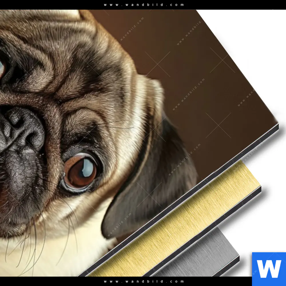 Aluminiumbild gebürstet | Mops mit Cheeseburger | Hochformat