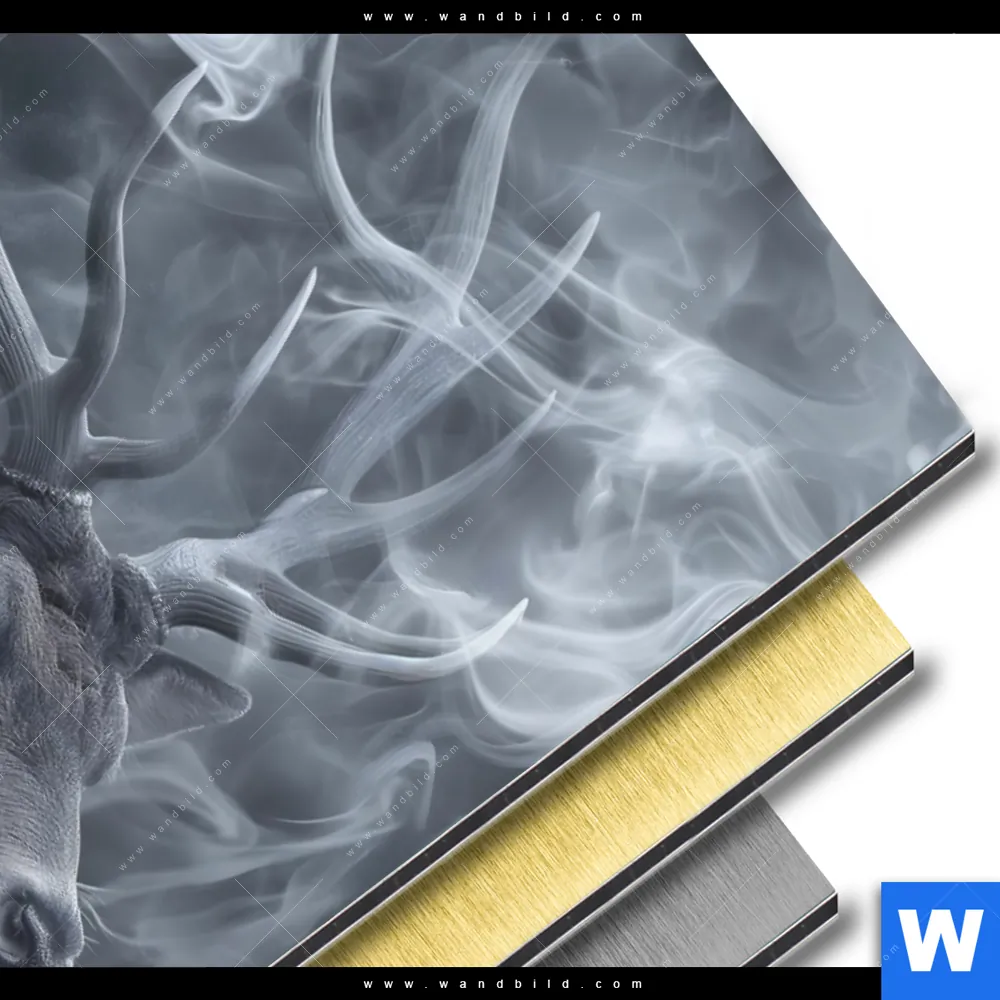 Aluminiumbild gebürstet | Mystischer Hirsch im Nebel | Hochformat