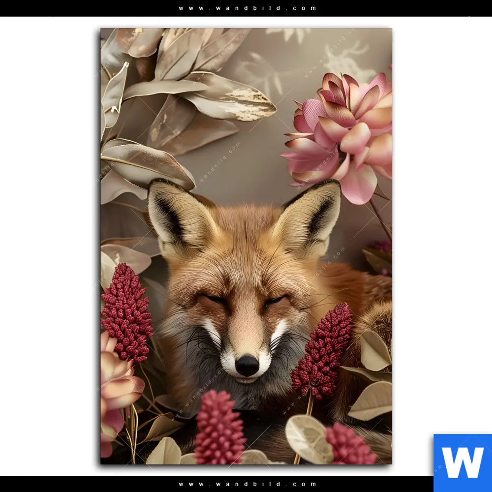 Aluminiumbild gebürstet | Naturbild Fuchs und Blumen | Hochformat