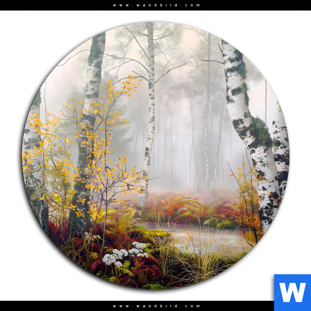 Aluminiumbild gebürstet | Naturidylle - Birken im Nebel | Rund