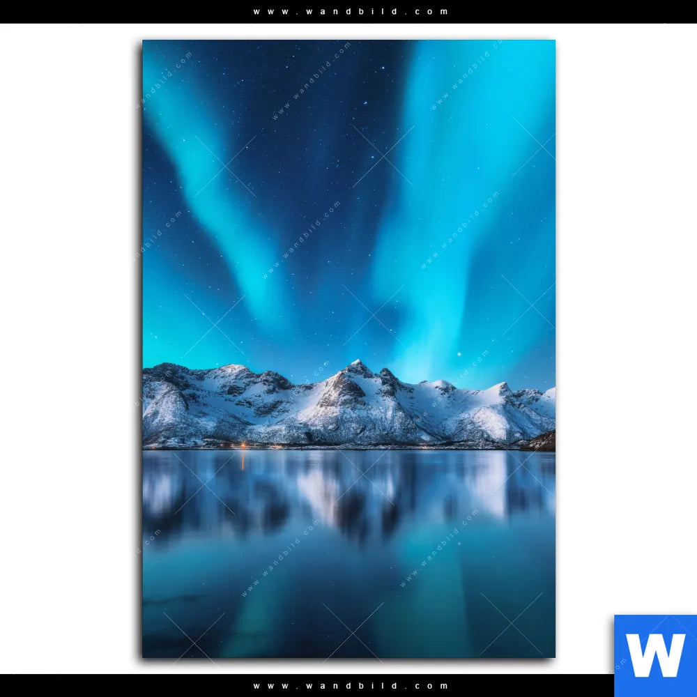 Aluminiumbild gebürstet | Nordlichter und schneebedeckte Berge | Hochformat