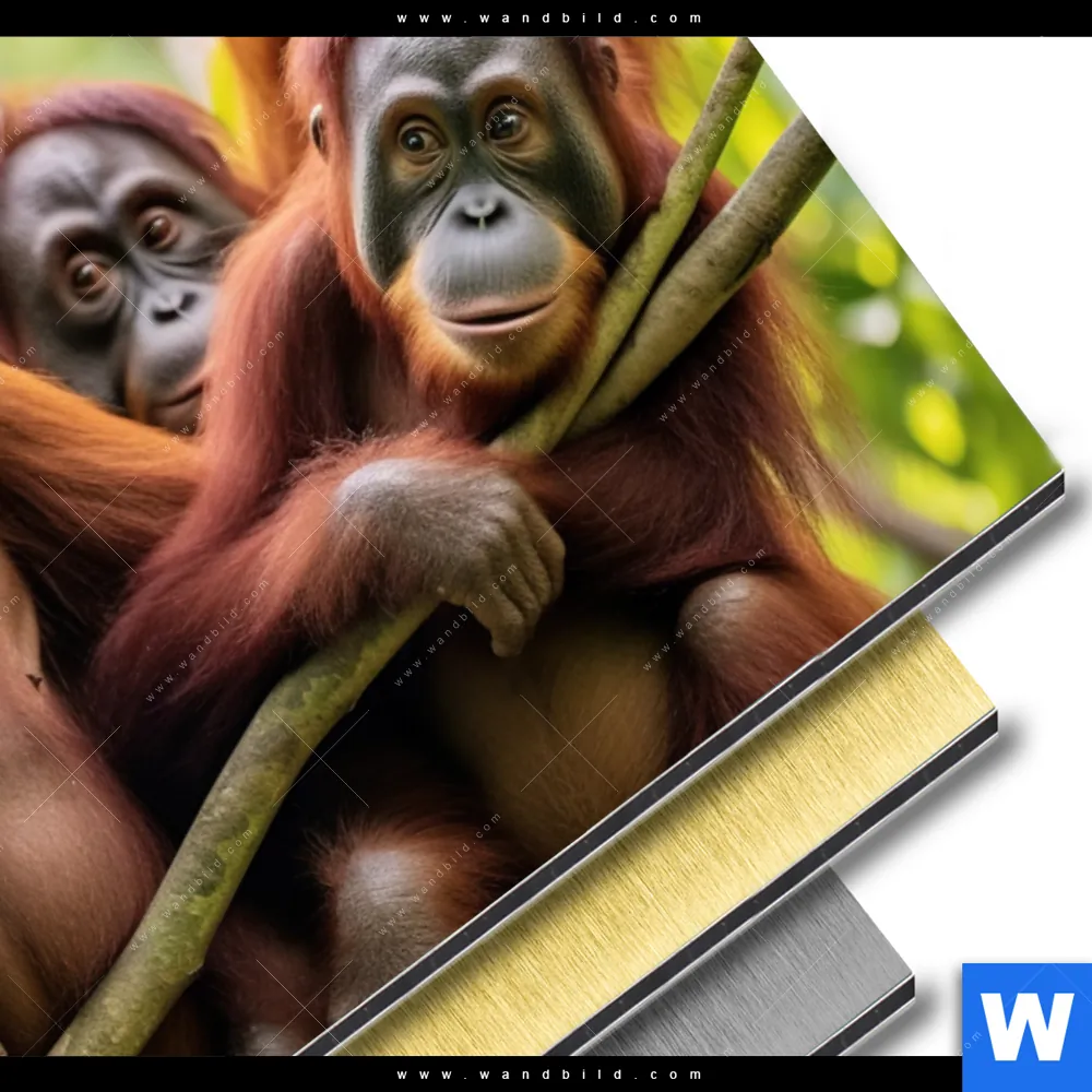 Aluminiumbild gebürstet | Orang Utan Familie im Regenwald | Querformat