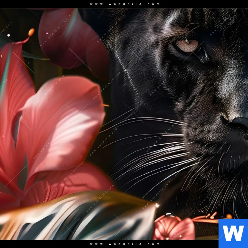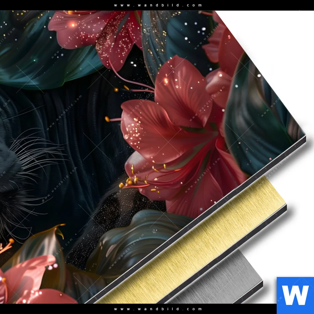 Aluminiumbild gebürstet | Panther und rote Blüten | Querformat