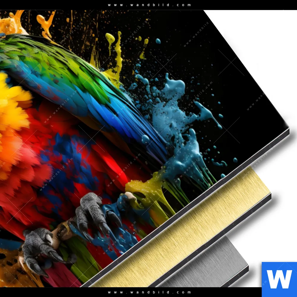 Aluminiumbild gebürstet | Papagei mit bunten Farbspritzern | Querformat