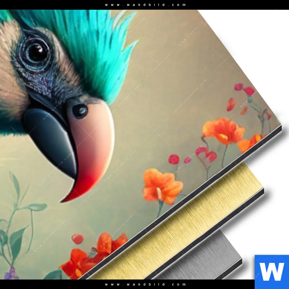 Aluminiumbild gebürstet | Papagei und tropischer Hibiskus | Schmal