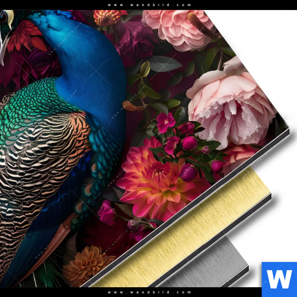 Aluminiumbild gebürstet | Prachtvoller Pfau und Blüten | Rund