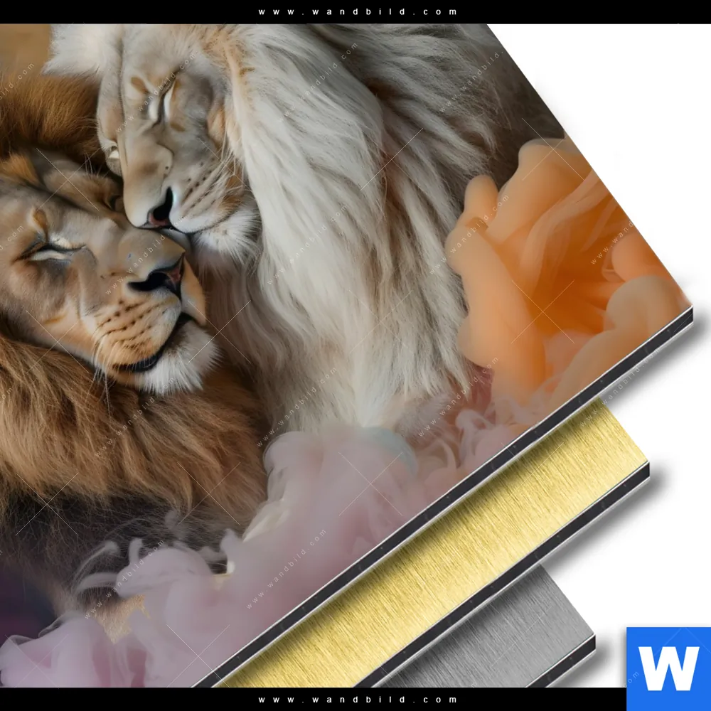 Aluminiumbild gebürstet | Sanfte Löwenmomente in buntem Nebel | Quadrat