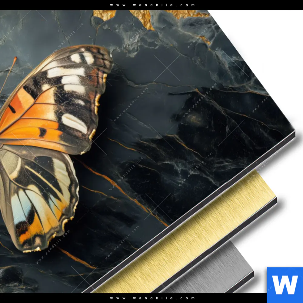 Aluminiumbild gebürstet | Schmetterling auf Marmor | Querformat