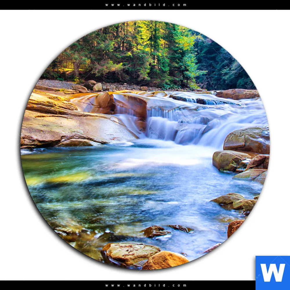 Aluminiumbild gebürstet | Schöner Wasserfall im Wald | Rund