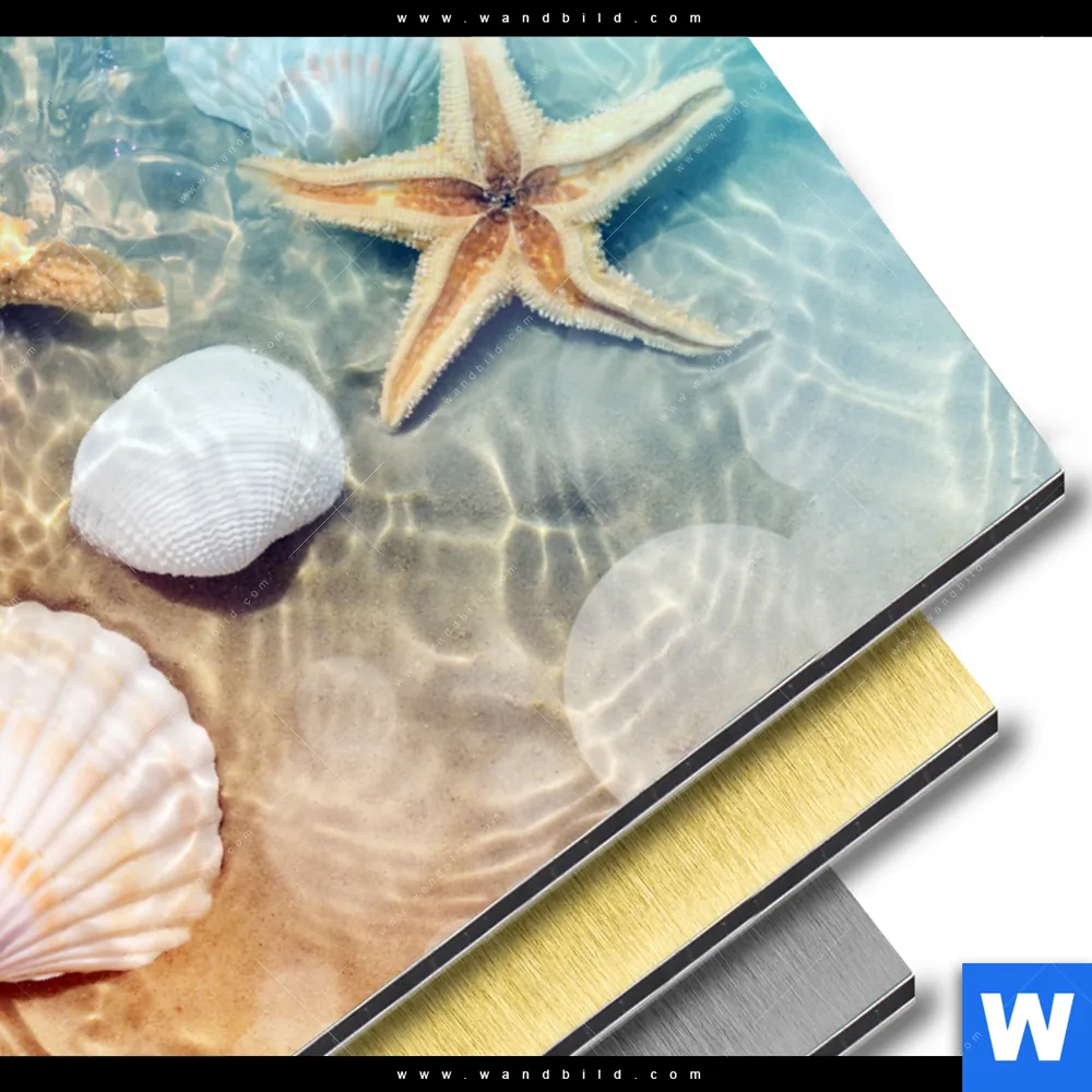 Aluminiumbild gebürstet | Seesterne & Muscheln | Hochformat